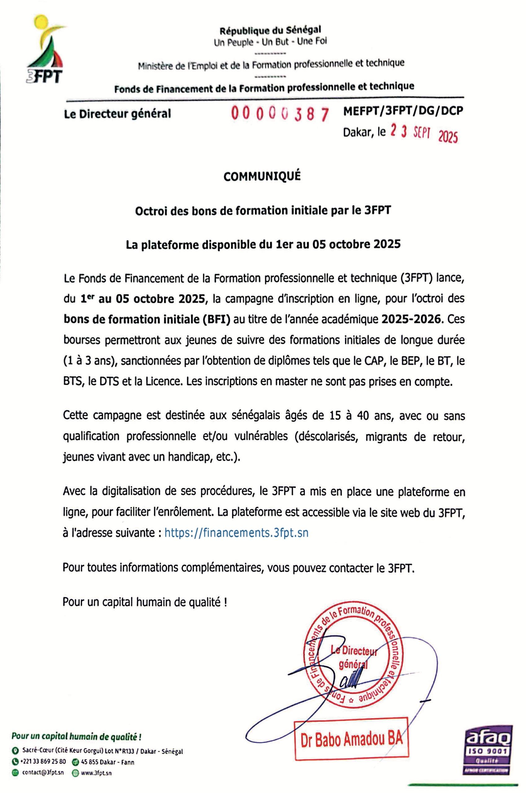 Á travers ce Communiqué, le 3FPT a le plaisir de vous informer que 𝗹𝗮 𝗰𝗮𝗺𝗽𝗮𝗴𝗻𝗲 𝗱’𝗶n𝘀𝗰𝗿𝗶𝗽𝘁𝗶𝗼𝗻 𝗲𝗻 𝗹𝗶𝗴𝗻𝗲, 𝗽𝗼𝘂𝗿𝗹’𝗼𝗰𝘁𝗿𝗼𝗶 𝗱𝗲𝘀 𝗯𝗼𝗻𝘀 𝗱𝗲 𝗳𝗼𝗿𝗺𝗮𝘁𝗶𝗼𝗻 𝗶𝗻𝗶𝘁𝗶𝗮𝗹𝗲 (𝗕𝗙𝗜), au titre de l’année académique 2025-2026, est prévue du 01 au 05 Octobre 2025.